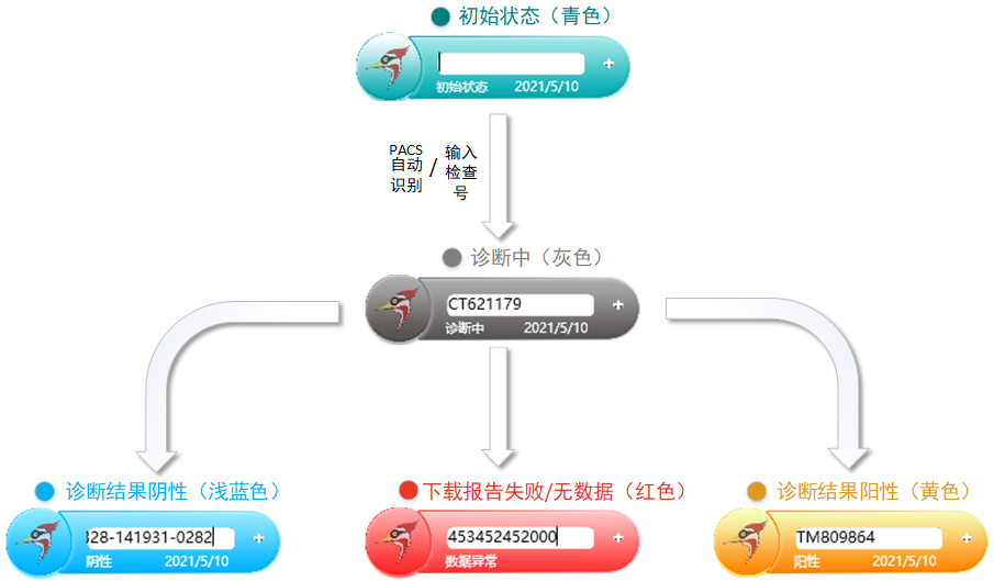 根據(jù)不同的診斷結(jié)果,“小啄”將呈現(xiàn)出不同的顏色,同時(shí),在“小啄”中間的輸入框下方顯示對應(yīng)的文字提示(診斷狀態(tài)、診斷日期),如下圖所示。