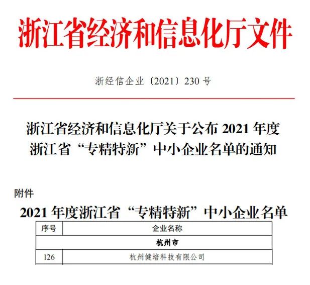 近日,浙江省經(jīng)濟和信息化廳公布了2021年度浙江省“專精特新”中小企業(yè)名單。 杭州健培科技有限公司成功上榜。