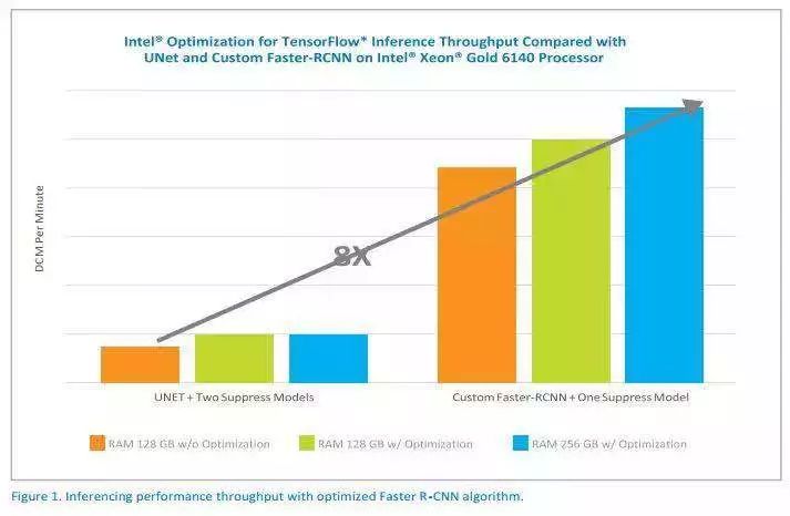 直至去年,健培利用英特爾至強(qiáng)金牌6140處理器以及英特爾對(duì)TensorFlow優(yōu)化的核心庫(kù)(MKL-DNN),將醫(yī)學(xué)影像深度學(xué)習(xí)性能大大提升,其中,自定義Faster R-CNN的性能整整提高了8倍以上。