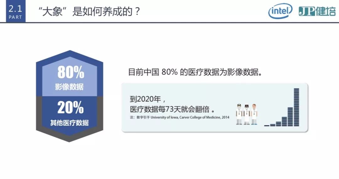 大象即醫(yī)學(xué)大數(shù)據(jù),包括電子病歷、影像、心電、病理、基因等大數(shù)據(jù),其中影像數(shù)據(jù)量最大,醫(yī)院存儲(chǔ)數(shù)據(jù)的80%以上來自影像數(shù)據(jù)。