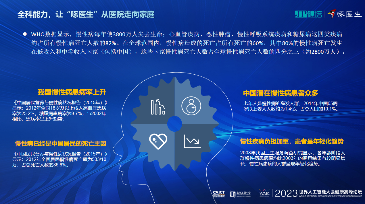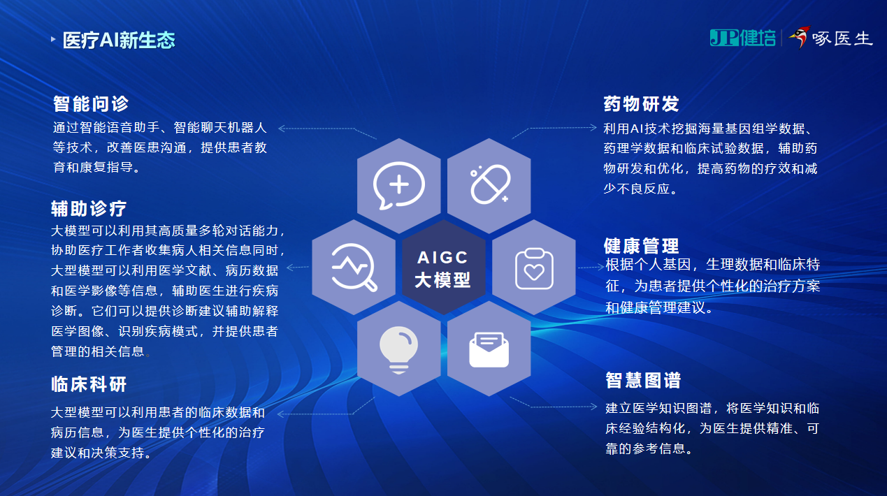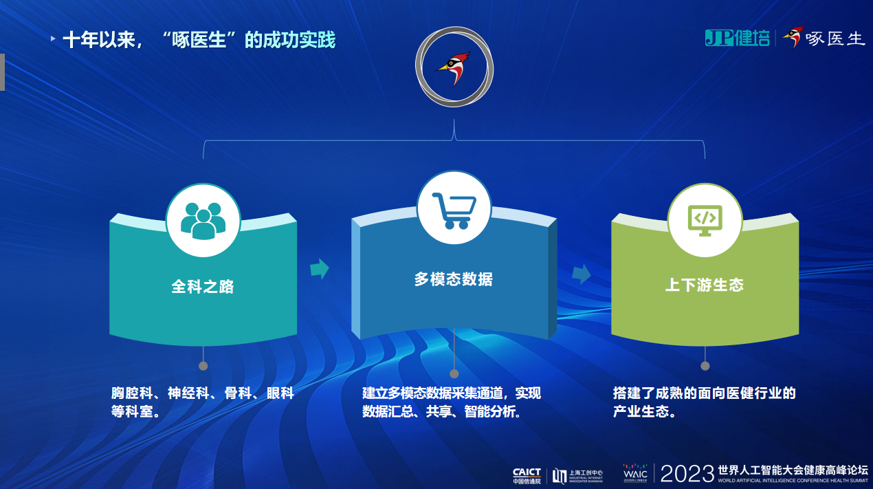 “健培科技從2012年開始的AI 2.0時(shí)代,到如今以AIGC為標(biāo)志的3.0時(shí)代,形成了比較完整的產(chǎn)品服務(wù)生態(tài),打通了諸多醫(yī)療與健康的鏈條。有了大模型技術(shù)的加持,未來十年,我們啄醫(yī)生將走入千家萬戶,當(dāng)好老百姓的AI家庭醫(yī)生!”程國(guó)華最后總結(jié)道。