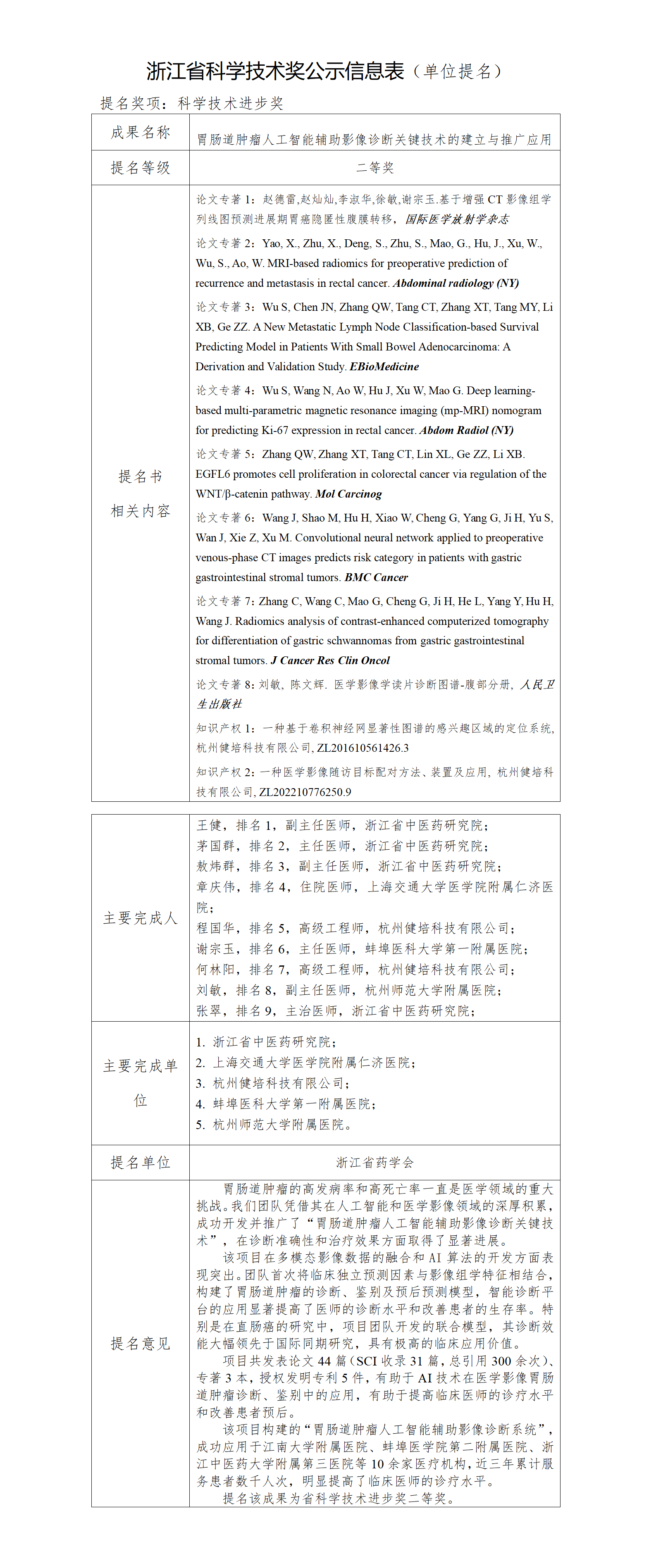 附件【2023年度浙江省科學(xué)技術(shù)獎(jiǎng)公示信息表-胃腸道腫瘤】