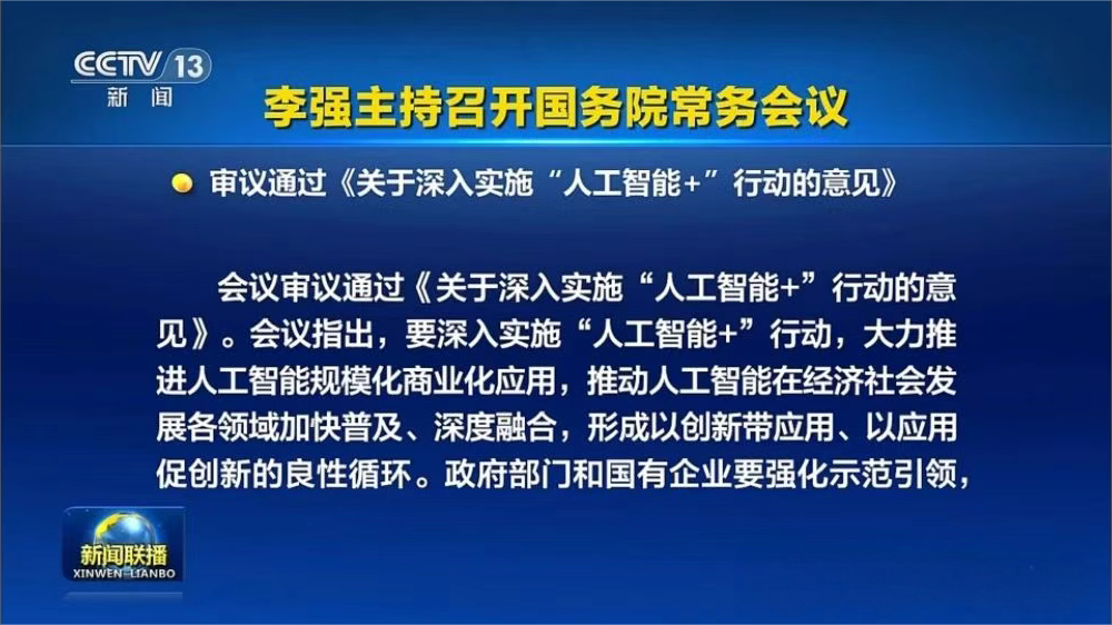 7月31日,國(guó)務(wù)院總理李強(qiáng)主持召開國(guó)務(wù)院常務(wù)會(huì)議,審議通過(guò)《關(guān)于深入實(shí)施“人工智能+”行動(dòng)的意見》。系統(tǒng)部署規(guī)?;瘧?yīng)用、生態(tài)構(gòu)建與安全治理框架。會(huì)議指出,要深入實(shí)施“人工智能+”行動(dòng),大力推進(jìn)人工智能規(guī)?;虡I(yè)化應(yīng)用,推動(dòng)人工智能在經(jīng)濟(jì)社會(huì)發(fā)展各領(lǐng)域加快普及,深度融合,形成以創(chuàng)新帶應(yīng)用,以應(yīng)用促創(chuàng)新的良性循環(huán)。