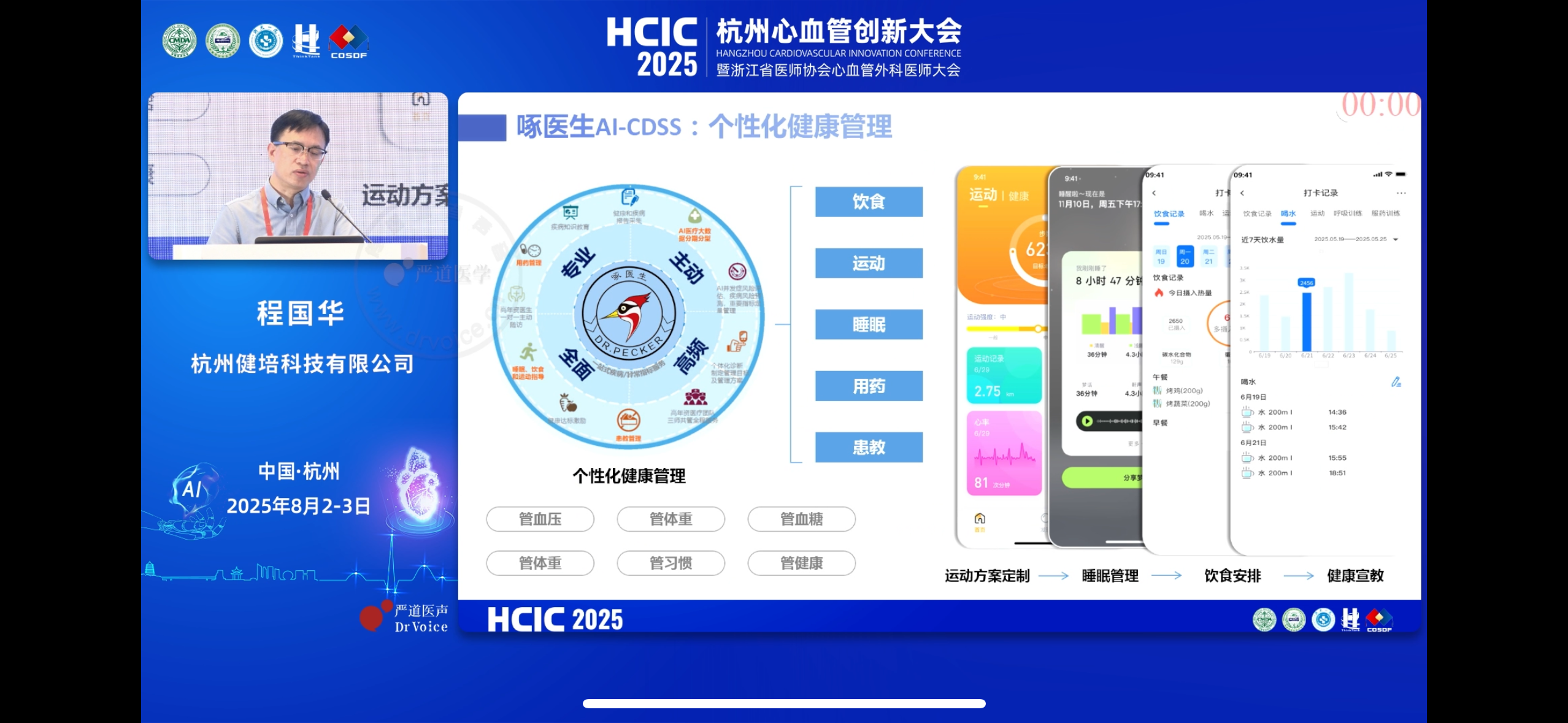 程國華在主旨演講中指出,作為新晉杭州AI十八羅漢,健培將創(chuàng)新的“基因”融入產(chǎn)學(xué)研用,通過“健康大腦+”體系架構(gòu),構(gòu)建全生命周期的數(shù)字健康生態(tài)系統(tǒng)。全國首家烏鎮(zhèn)智能醫(yī)院的落地,加快推進(jìn)“智慧服務(wù)”、“智慧診療”、“智慧管理”三位一體的智慧醫(yī)院建設(shè)。同時,深入實施“人工智能+”行動,大力推進(jìn)人工智能規(guī)?;虡I(yè)化應(yīng)用。大力打造以防、篩、管、治新范式的心血管智能化改革。并詳細(xì)的從一、從影像分析到精準(zhǔn)檢測;二、從NLP到多模態(tài)融合;三、從單任務(wù)到智能體平臺?? 心血管疾病AI-CDSS系統(tǒng)這三方面重點闡述AI在心血管疾病中的應(yīng)用實踐以及未來趨勢。