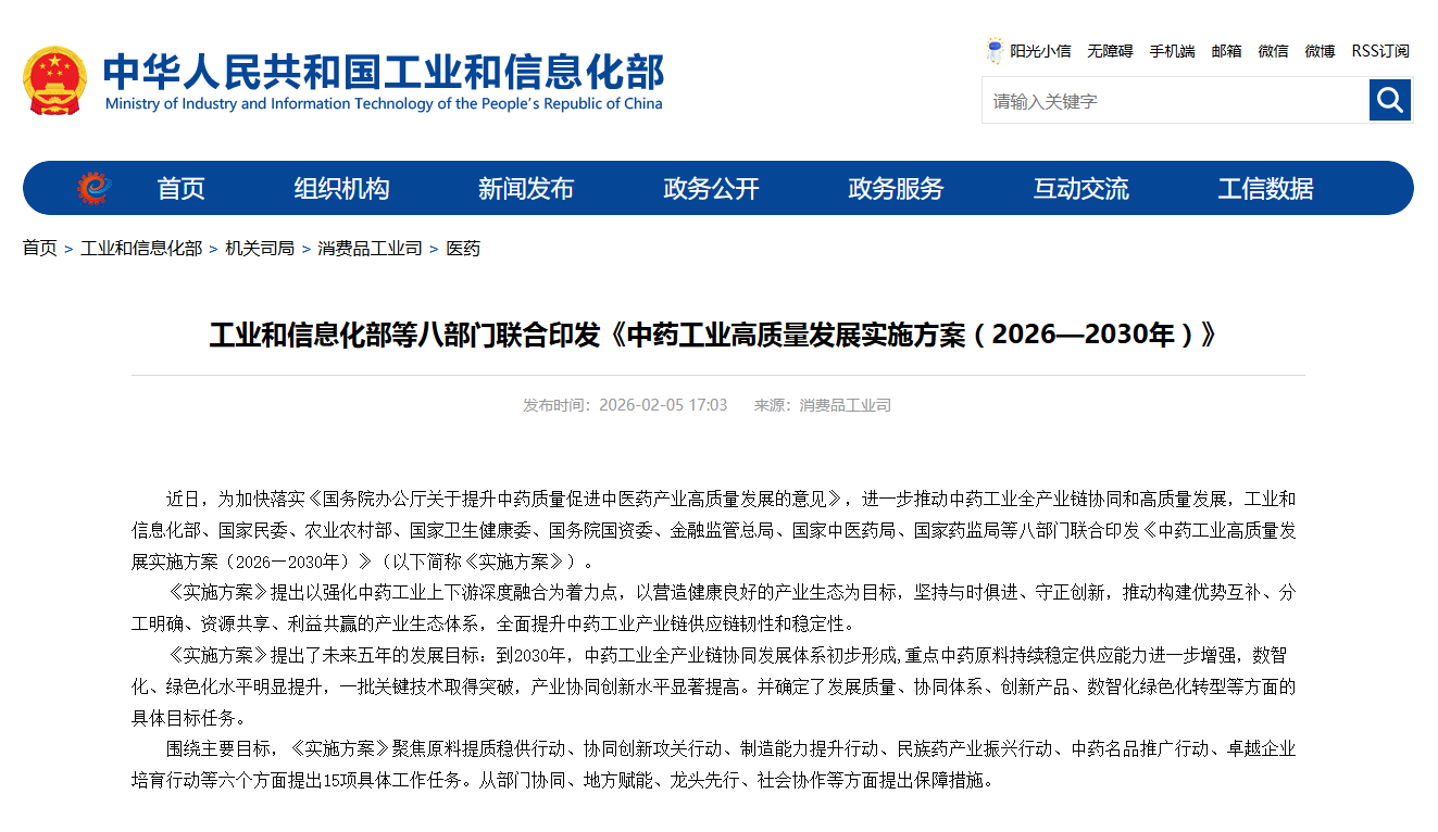《實(shí)施方案》提出了未來五年的發(fā)展目標(biāo):到2030年,中藥工業(yè)全產(chǎn)業(yè)鏈協(xié)同發(fā)展體系初步形成,重點(diǎn)中藥原料持續(xù)穩(wěn)定供應(yīng)能力進(jìn)一步增強(qiáng),數(shù)智化綠色化水平明顯提升,一批關(guān)鍵技術(shù)取得突破,產(chǎn)業(yè)協(xié)同創(chuàng)新水平顯著提高。